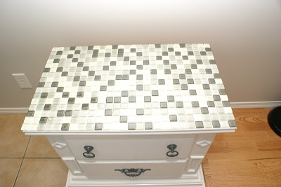 And here is our (almost) finished masterpiece (we went back and fixed up a few of the imperfections you can see here - gaps in the edges etc.). I am no longer afraid that I am going to scratch the top of the furniture; these tiles are taking a beating and they are holding up very well. I think it also adds a bit of pizazz to the front entrance and makes the piece look a little bit less like a nightstand.